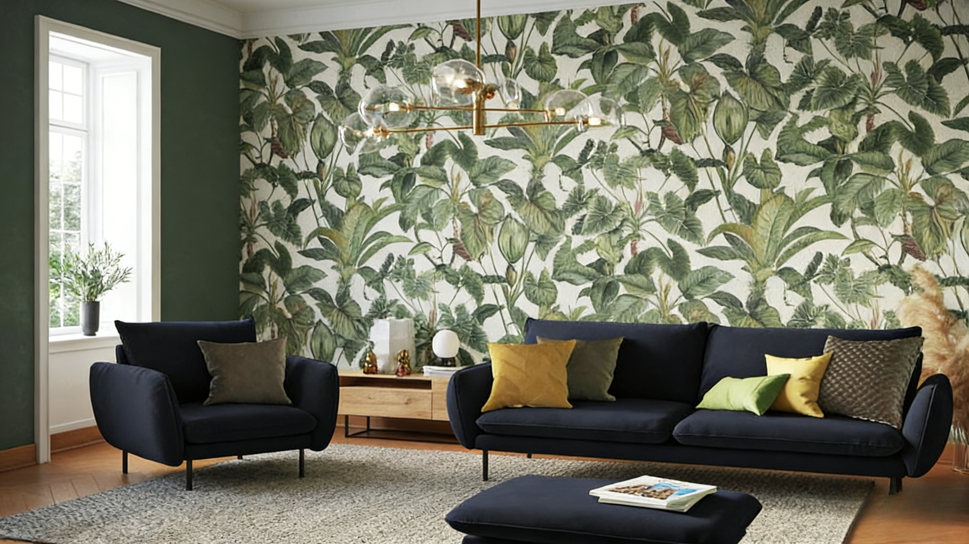 L'association de tons bleus et de détails en velours crée une ambiance chaleureuse et naturelle.